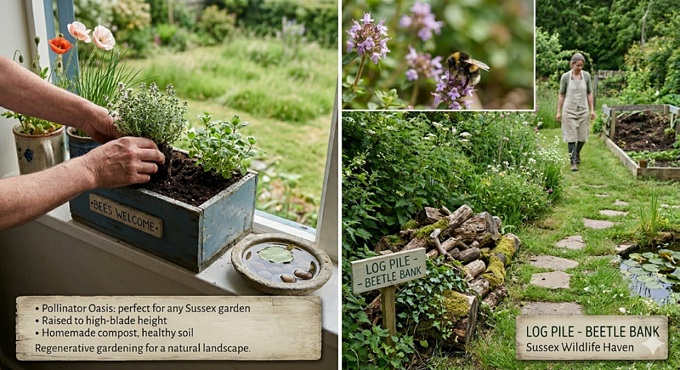 Window Box: Plant organic Thyme. A vital "oasis" for urban bees. Small Patio: Add a Mini-Pond in a shallow dish. A life-saving drink for birds. Medium Garden: Leave a "Wild Patch" of long grass for butterfly caterpillars. Large Garden: Build a Log Pile to house beetles—your frontline defense in a Sussex Wildlife Haven.